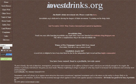 Anyone considering investing in wine would be wise to first take a look at this website, written by drinks journalist and Decanter contributor Jim Budd. It offers sound advice and points out the potential risks and pitfalls involved. His blog http:// investdrinks-blog.blogspot.co.uk/ is also worth reading, and offers commentary on specific cases, dodgy companies and shady individuals.