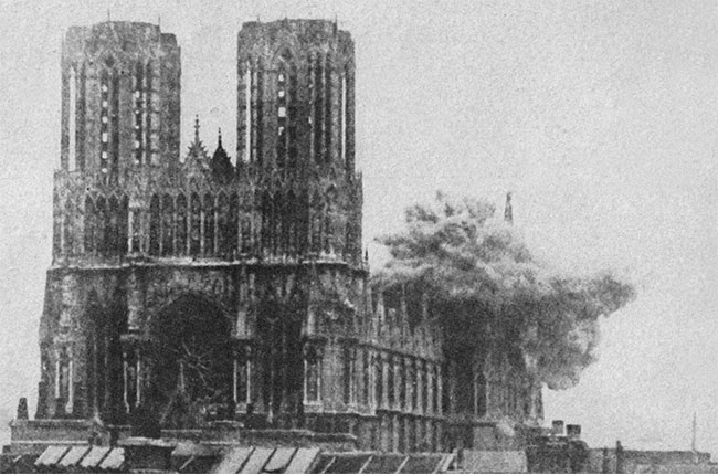Reims cathedral was among the first casualties after German artillery caused the building to catch fire in September 1914.