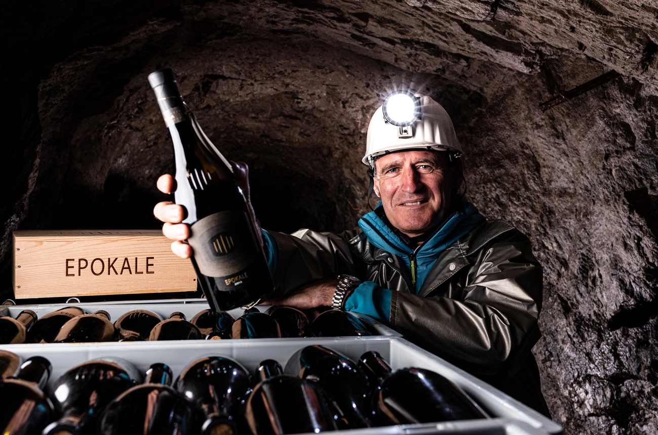 After bottling, Epokale completes its maturation process in unique conditions: just over 100 kilometres to the north, close to the border with Austria, lies the abandoned silver mine at Val Ridanna, at over 2,000m above sea level. Buried four kilometres down, deep inside the mine, Epokale spends the next six years in total darkness in an atmosphere which maintains a constant temperature of 12°C and 90% humidity – an ideal environment for ageing wine.