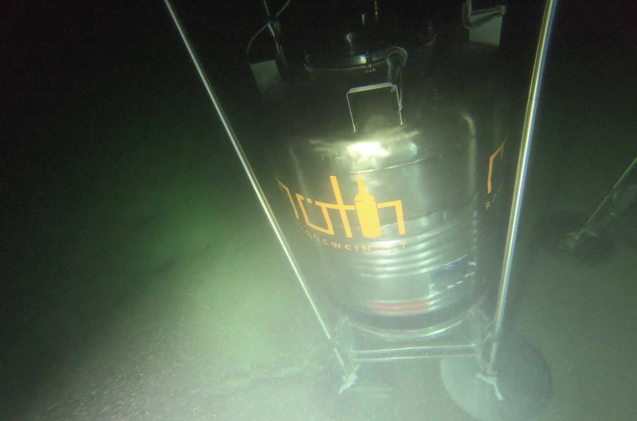 Known as ‘project Tiefenrausch’, the wine-filled tanks were immersed in 2019 and spent more than a year on the sandy lake bed, where temperatures were around five to seven degrees Celsius.
