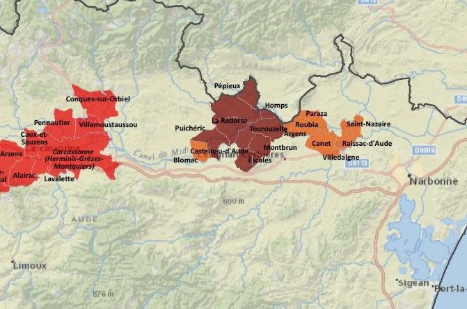 A map showing where hail struck in Aude. Worst affected areas in darker shading. Image: Aude Chamber of Agriculture