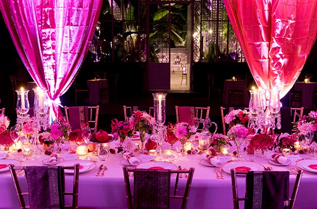 Finally, guests were led past the imposing glass ‘Jardin d’Hiver’ to a long banqueting table covered in gold-embroidered pink fabric, flowers and bowls of fruit.