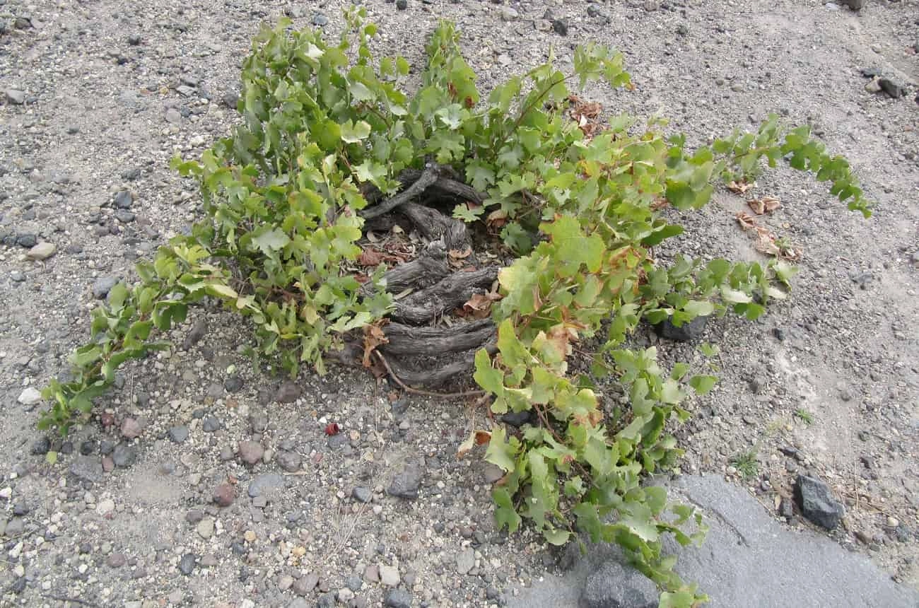 This low-lying circle not only protects grapes from the vicious hot winds that can sweep over the island, from but traps moisture from the sea mists that pervade the island at night.