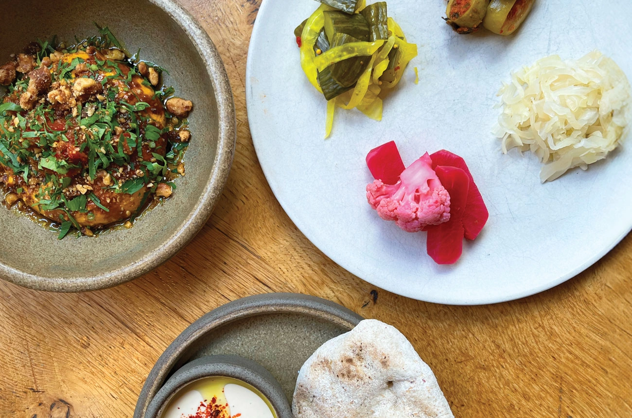 I’m sitting in Rovi in London, one of Yotam Ottolenghi’s restaurants, with a selection of small plates. The ingredients read almost like a gastronomic dictionary, a multi-textured, multicoloured assault on the senses. There’s vivid coal-roasted beetroot with dried shiso leaf of an almost iridescent pink, many-hued pickles, celeriac shawarma with bkeila and fermented tomato.